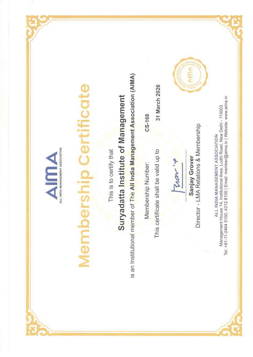 Suryadatta Institutes of Management is proud to be an institutional member of the All India Management Association (AIMA), the apex body for management in India. Our membership number is CS-168. This association reflects our commitment to academic excellence, industry interface, and continuous professional development through collaboration with one of the most prestigious management bodies in the country.